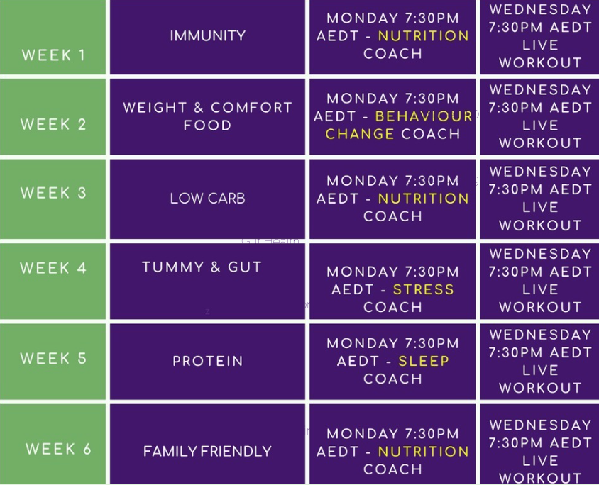 - Each week there will be a LIVE group coaching session on holistic health areas including sleep, fitness, nutrition, behavior change, anti stress and mindset